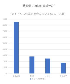 能够看到,在yahoo新闻数量上,《鬼灭之刃》一骑绝尘,跑在了《刀剑神域》、《NARUTO》、《天气之子》的前面。