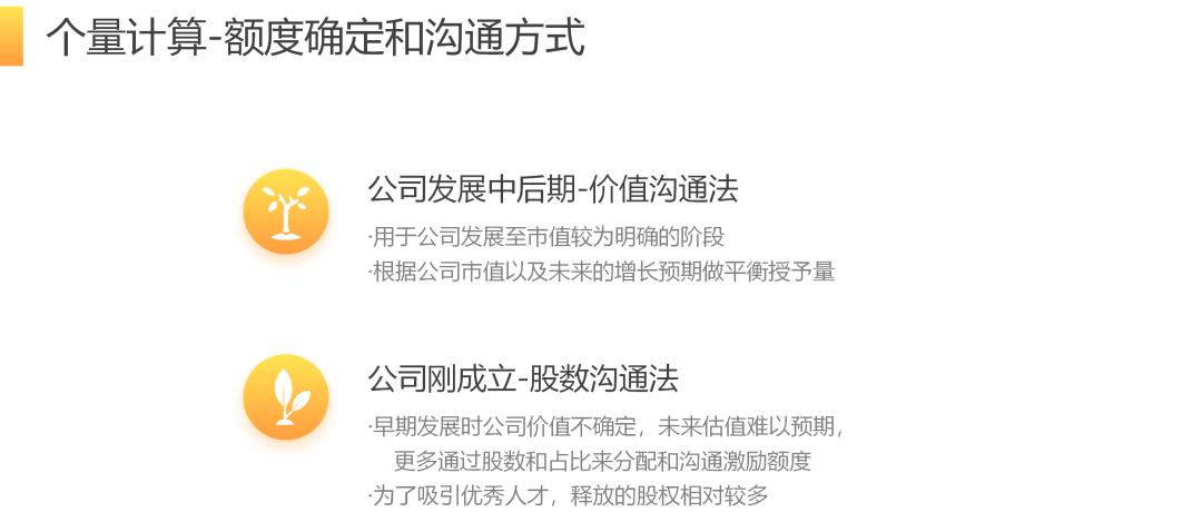 总量确定了,接下来就是具体每个员工的激励额度。激励额度的确定和沟通一般有两种方式,一个是价值沟通法,一个是股数沟通法。