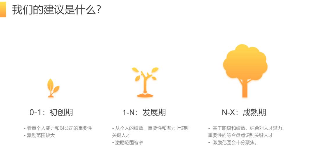 到了1-n的发展期:往往会结合人才盘点,从个人的绩效、重要性和潜力上识别关键人才,激励范围开始收窄;