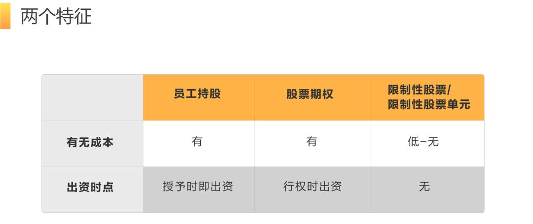 在区分三种股权激励工具的本质时可以抓住两个特征:有无成本、出资时点。