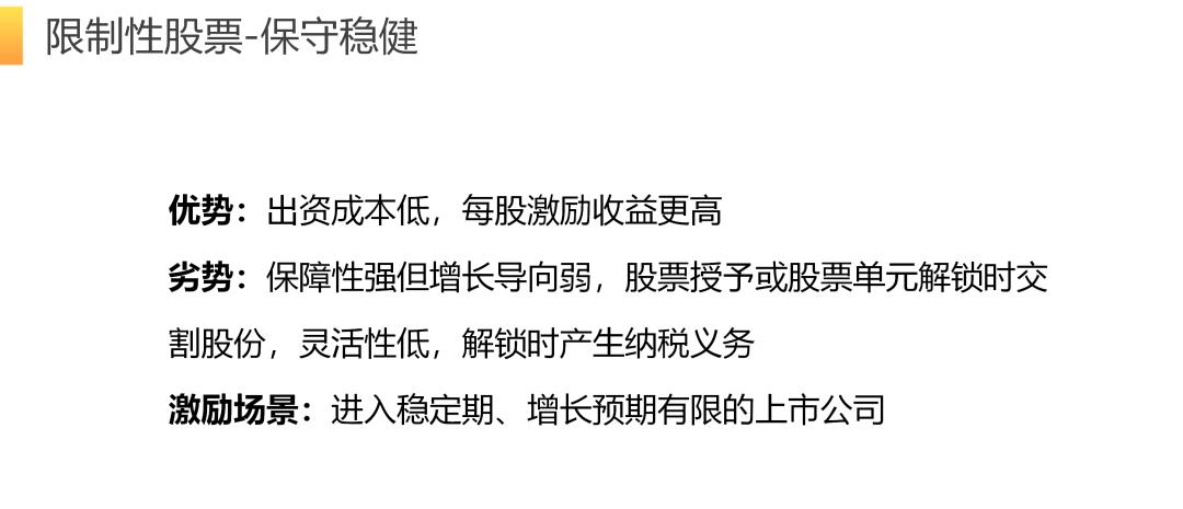 但过于稳定的收益方式很容易使得激励对象过于关注现值,增长动力不足,且公司支付成本较高,所以此类工具更适合进入稳定期,基本盘较大,增长空间有限的公司。