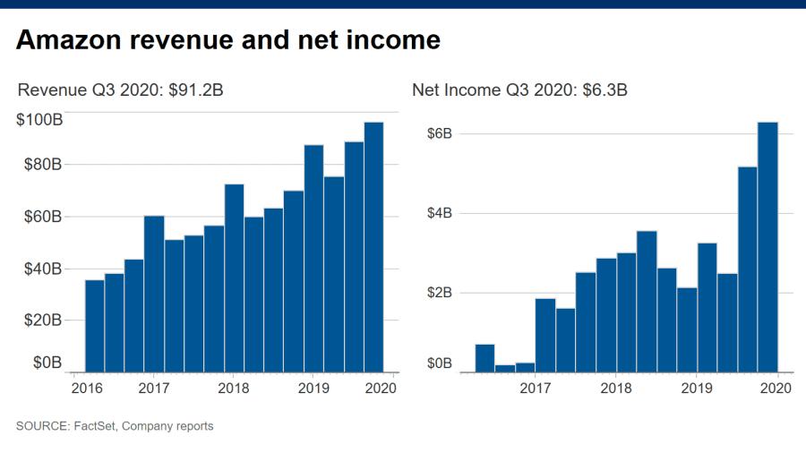 亚马逊2020年第3季度营收和净利润。其中,净利润突破新高,达到了63亿美元。图片来源:FactSet, Compnay reports