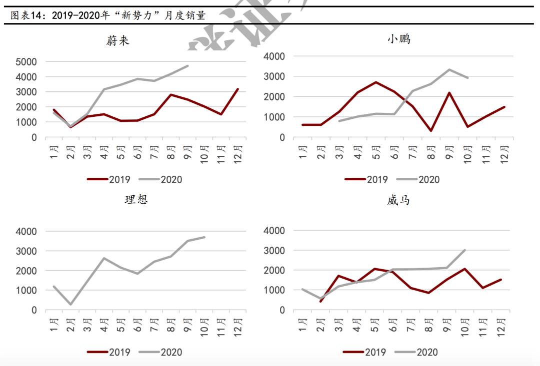 2020年蔚来小鹏理想威马月销量大幅增加,图源:万联证券