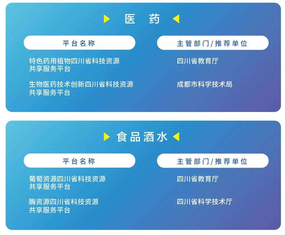 此次发布的20家平台有13家基础条件类平台,包括:3家基础科学服务平台,3家农业平台,2家医药平台,2家食品酒水平台,1家制造业平台,1家能源平台和1家核技术平台。科技与实业两手抓,两手都要硬,是四川对于未来发展的期望。