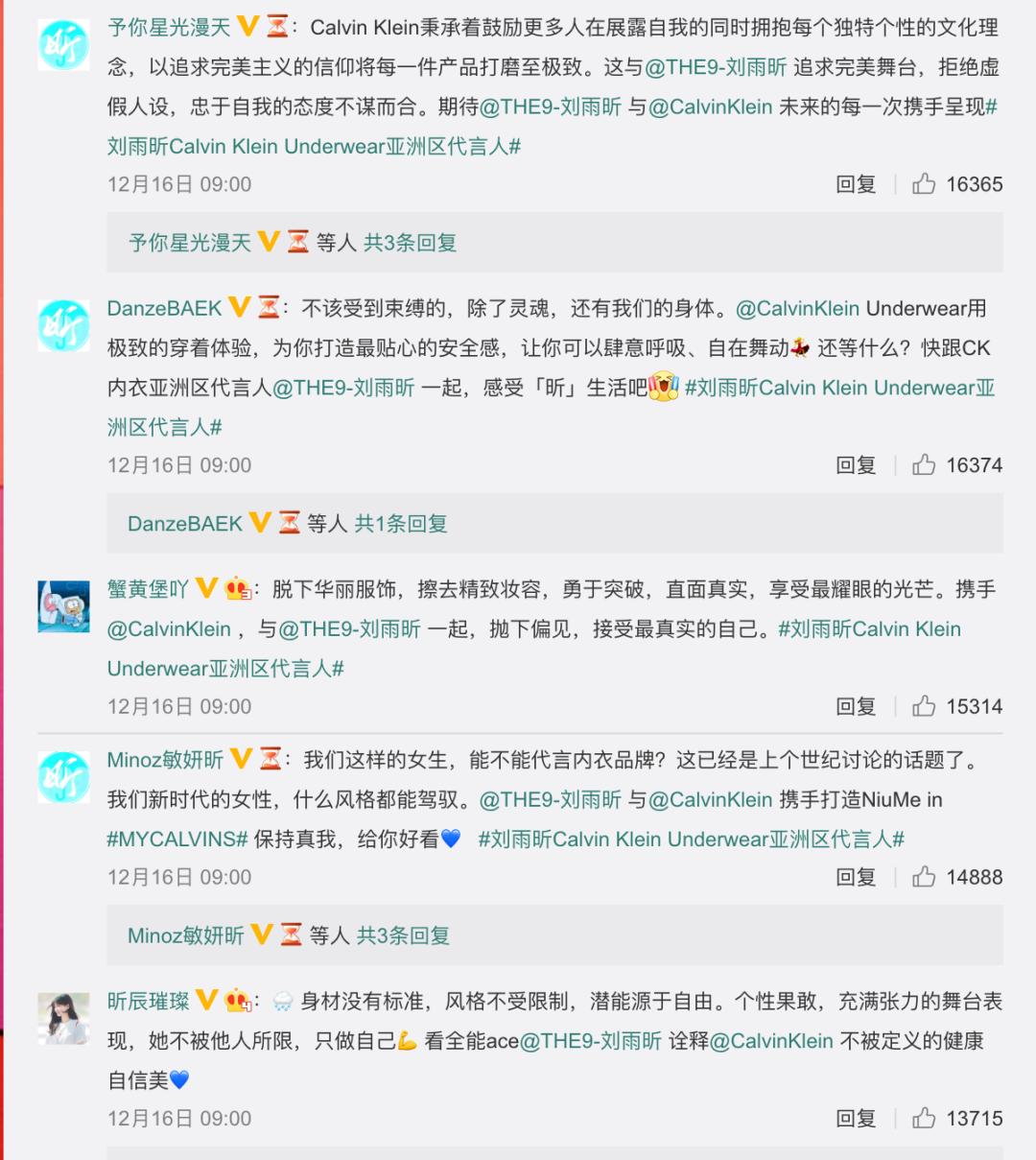 回到本次代言营销事件本身,我们可以看到和传统内衣市场营销不一样的是,CK选择了一位很“另类”的代言人,和大众传统审美有很大的出入。刘雨昕作为一个新晋艺人,她自出道起就带有标签是:中性风,她算是非传统意义上的女团形象,既不性感也不妩媚,但整体来看却是帅、美。从当代审美视角来看,她应该是代表无性别形象的艺人,这种综合的特质也确实在一定程度上打破了网友们对于内衣市场原本认知。