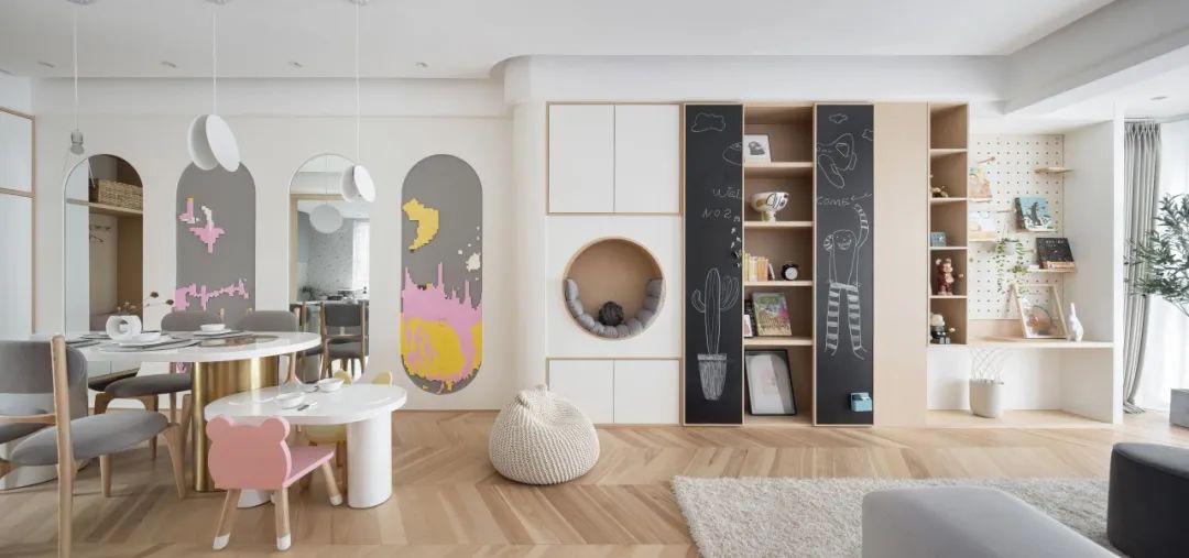 以平等的姿态对待孩子,是从设计开始尊重彼此。客厅的中心不再是传统的电视,变成了可以沟通、游戏、学习的多功能厅。在通透的空间内,爸爸在这里办公,小朋友在旁边写作业做手工,父母可以随时回应孩子发出的需求信号,陪伴无时不在。