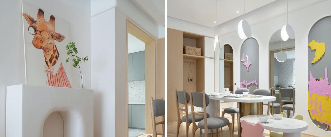 有孩子的家不一定就是乱糟糟,相对开放、低矮的收纳设计,让小朋友也可轻而易举参与到日常的整理当中。大部分家具根据小孩适用的尺寸定制,大餐桌旁还有儿童小餐桌,对大人、对孩子都实用而顺手。长大后或许没人会记住去过几次迪士尼,全家晚餐时其乐融融的场景会深深烙印在记忆深处。