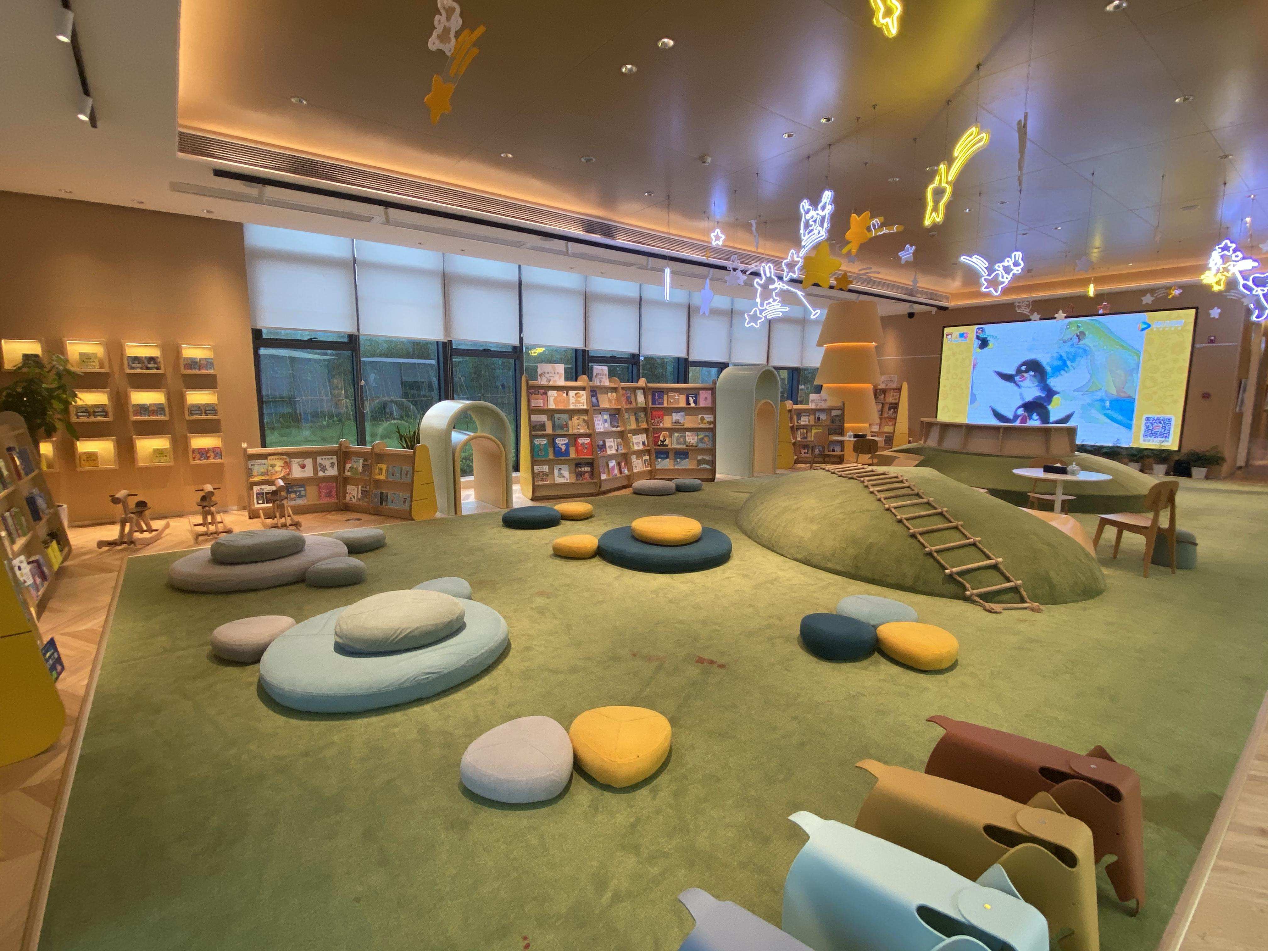中国首家社区绘本中心便落地在长房·君悦五大场景之一的知行空间,同时阅读便利书架如插件融入在其他四个场景空间,让社区共读共情无处不在。这里不仅有专家推荐的分龄书单, 一年 52 个主题书单持续刷新,还引入言几又旗下品牌言宝乐园 YJY.KIDS,让孩子看到更大的世面。