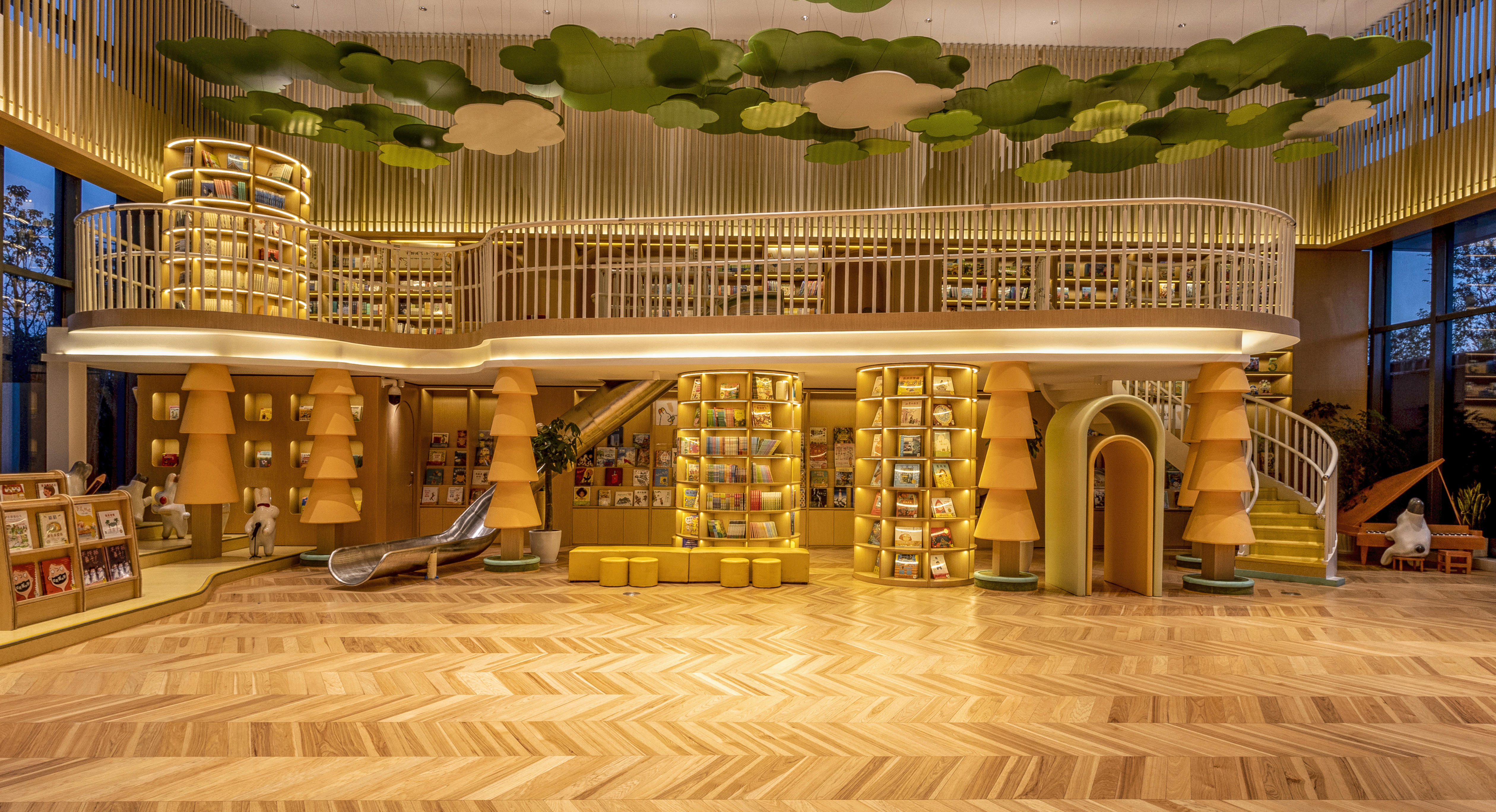 知行空间的视觉与空间设计上,更是对阅读友好这一生活方式的理解和传递。挂满星星彩虹灯的屋顶、随处可坐可躺的软垫、从二楼通向一楼的滑梯,引发孩子的好奇心,给予他们充分的阅读自由。