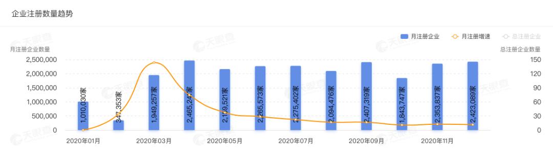 据天眼查专业版数据显示,截至12月28日,2020年全年新增注册企业23594845家,和去年全年注册数20235145相比,增幅近17%。继2月份数据萎缩之后,从3月份开始注册数在每月2000000家左右徘徊,其中4月份注册企业数量最多,为2465241家。其次为12月份,注册企业为2423089家。