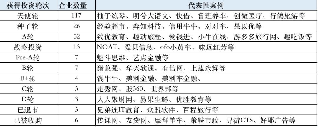 在今年死亡的近千家企业中,有18%左右的企业进行过融资披露。其中,有143家企业获得天使轮/种子轮投资。52家企业获得 A 轮融资。已被收购企业有6家,分别为传课网、友贷网、摩拜单车、策轶市政、寻游CTS、好耶广告等,已退市企业有3家,分别为兄弟连IT教育、众盟软件、百程旅行。