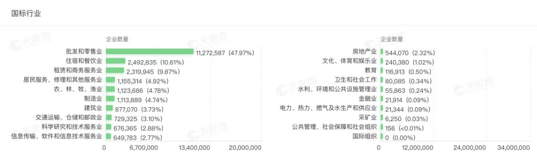 按国标行业分类,批发和零售业、住宿和餐饮业、租赁和商务服务业位于前三名。其中,批发和零售业以47.97%的高占比居于首位。制造业企业注册数为1113889家,占比4.74%。交通运输、仓储和邮政业企业注册数为729325家,占比3.1%。科学研究和技术服务业、信息传输、软件和信息技术服务业的注册企业数为676365家、649783家。金融业注册数寥寥,21914家占比仅为0.09%。