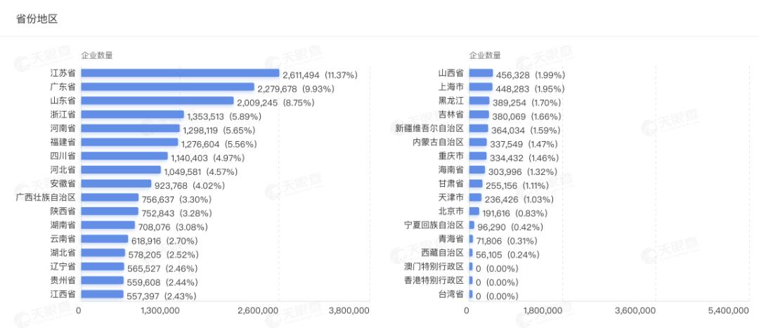 从地域分布看,江苏注册企业最多,为2611494家,占总注册数量的11.37%。其次为广东和山东,分别为2279678家和2009245家。