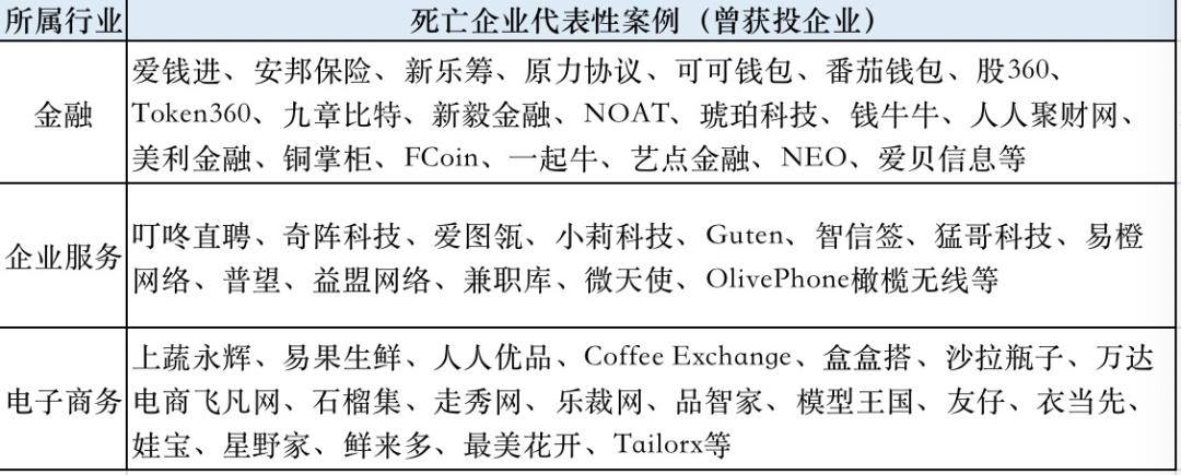 除上图中所示领域及案例外,教育行业的兄弟连、明兮大语文、百弗英语、趣动旅程、传课网,汽车交通领域的ofo小黄车、博郡汽车、猪兼强,游戏领域的游悦网络、比麟科技、我的世界精灵、智精无线,文娱传媒领域的触手TV、九月光合、小葱;社交网络的帕斯菲德、天天租我等,均未能走到2021。