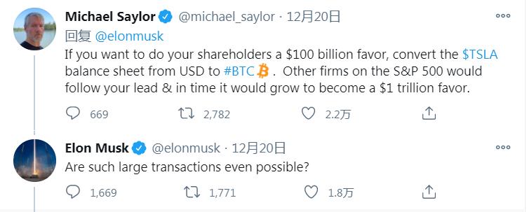 当地时间12月20日,马斯克在推特上向Michael Saylor询问将特斯拉资产负债表上的“大额交易”转换为比特币的可能性。Saylor建议马斯克行动:“如果您想为股东提供1000亿美元的好处,请将特斯拉的资产负债表从美元转换为#BTC(比特币)。”不过,马斯克对此仍有疑惑。