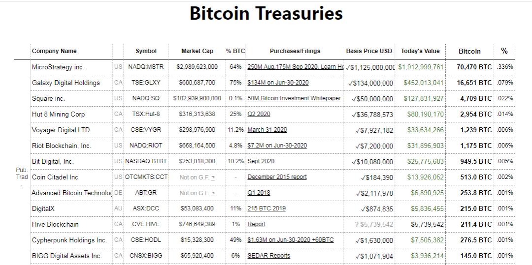 部分投资比特币的机构 图片来源:Bitcoin Treasuries官网截图