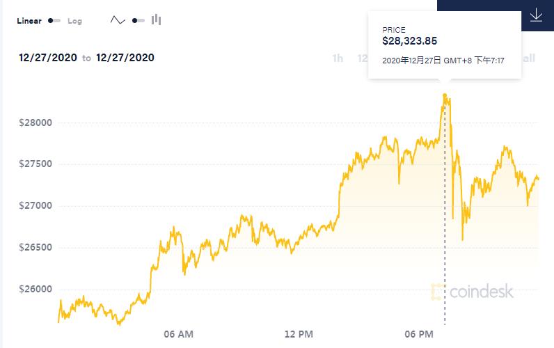 彼时,他讲出这番话的时候,比特币还在13000美元左右徘徊。约2个月后,比特币于12月16日首次站上20000美元大关,随后继续一路狂奔。Coindesk数据显示,12月27日,比特币持续上攻,一度突破28000美元/枚,最高触及28323美元。