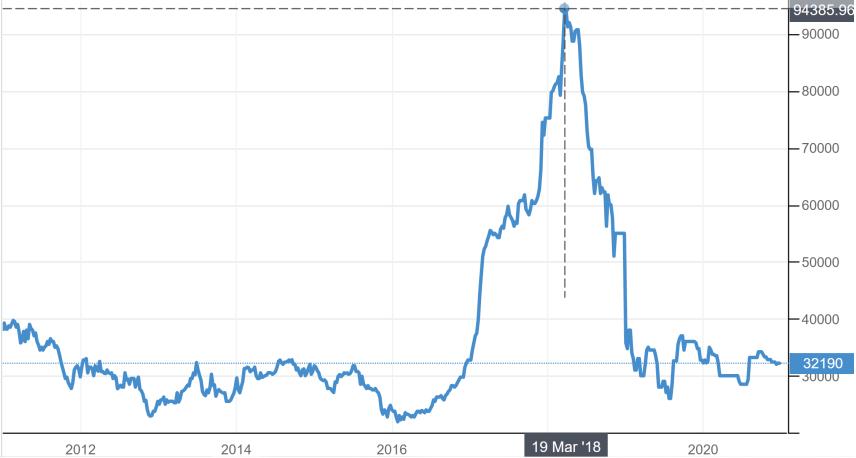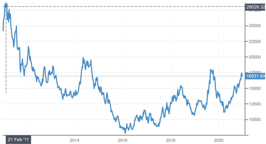 镍价走势图(单位:美元/吨)(来源:TRADING ECONOMICS)