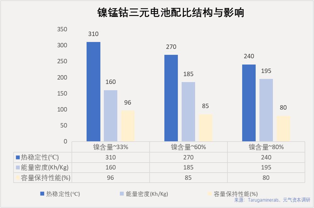 如下图所示,以镍锰钴(NCM)三元电池为例,当镍的比重从33%(镍、锰、钴比例为1:1:1)上升到60%(镍、锰、钴比例6:2:2)时,能量密度有了15%的显著提升,但同时热稳定性和容量保持性能也有了明显下滑。