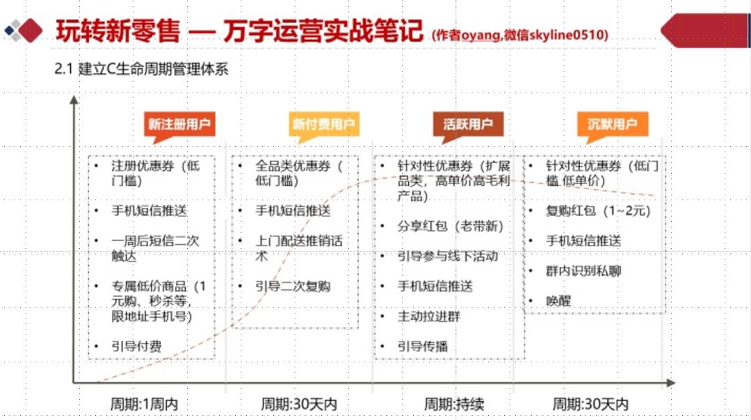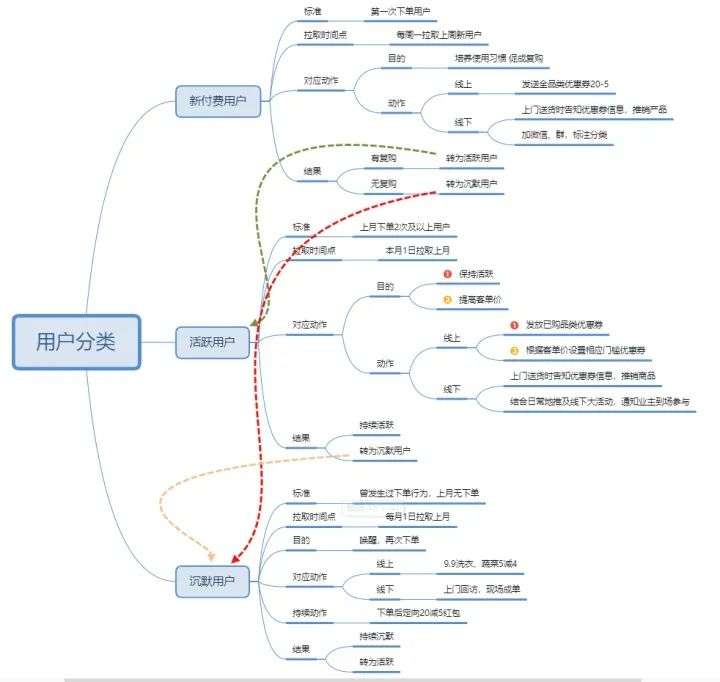 例如新付费用户的定义是:上一周内第一次下单的用户。对这类用户的运营目标是:促二次复购,对应的运营动作是:线上发放全品类低门槛优惠券,线下上门送货时提醒,并加群加微信。