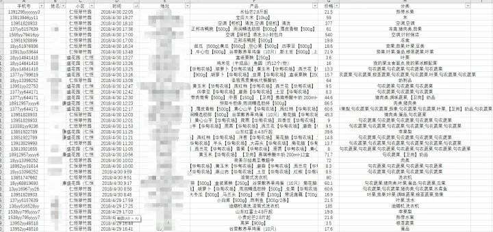 以上是一张后台导表数据,这里字段包括了手机号+姓名+时间+地址+商品+商品分类几个要素。