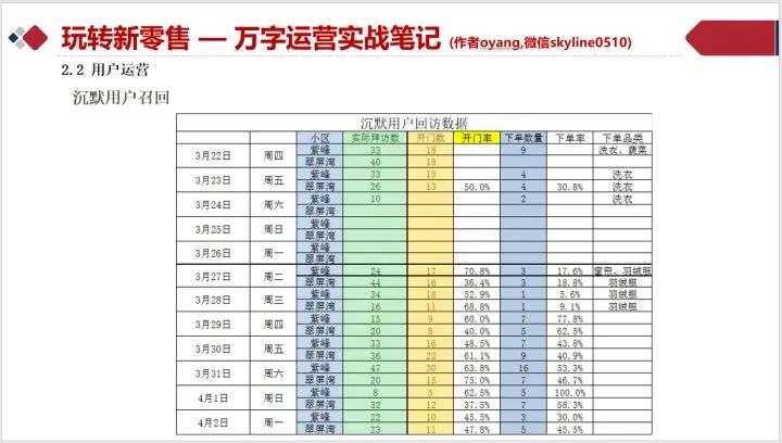 同样还有一次我们发现某个小区的次周留存率近乎100%,所以立刻找到了这个小区门店的客服小妹,详细询问了她这批拉新是如何做的,每个环节的策略话术方法等等。