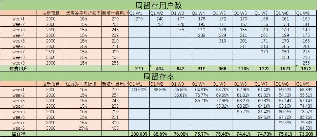 里面有几个参数,第一列是时间,从第一周到第九周;第二三列是拉新预算和优惠券折扣率两个变量参数,蓝色部分是留存数和留存率。