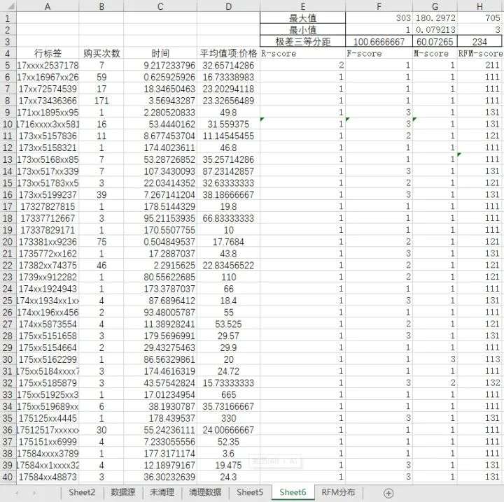 下图为某小区RFM用户表部分截图,为保护用户隐私,手机号码和相关数据已做处理: