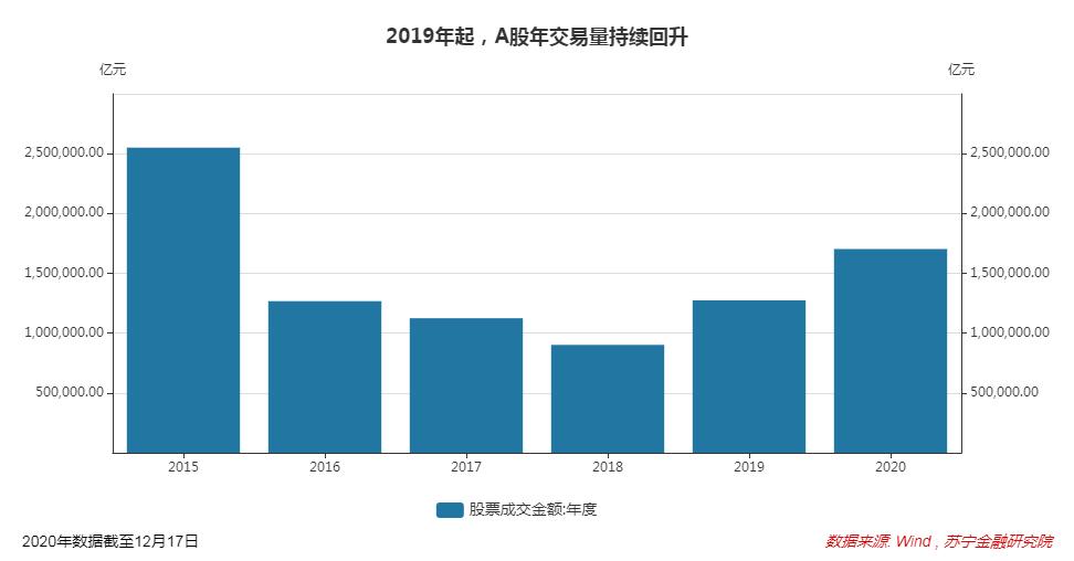 临近年底,很多券商发布2021年策略报告,乐观者预测指数突破4000点,甚至还能向上再看1000点;也有悲观者担心指数仍无法挣脱箱体波动格局。不过,在很多人看来,2021年的投资收益大概率难以媲美2019年和2020年(截止2020/12/17)。这两年,沪深300指数的涨幅分别为36%和22%,创业板指数更是录得44%和55%的靓丽表现,同期市场交易量也是逐年抬升。