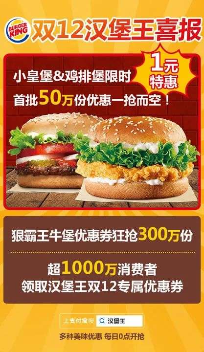 今年支付宝双12大促的主旋律,属于麦当劳、肯德基、汉堡王三家洋快餐品牌。
