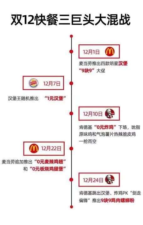 为期一个月的2020年双12大促,麦当劳、肯德基、汉堡王三家,掀起一场史无前例的价格战。麦当劳率先推出4款9.9元汉堡,汉堡王紧随其后把价格压到1元,最后进场肯德基直接卖起0元炸鸡。麦当劳在全球市场(除了中国)一直力压着肯德基,当然不能输掉这场战斗,立马追加了0元麦辣鸡翅和0元板烧鸡腿堡。