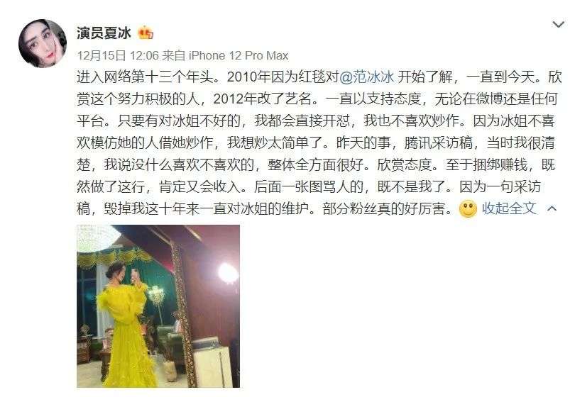 ▲ 夏冰在微博对《贵圈》采访稿作出回应