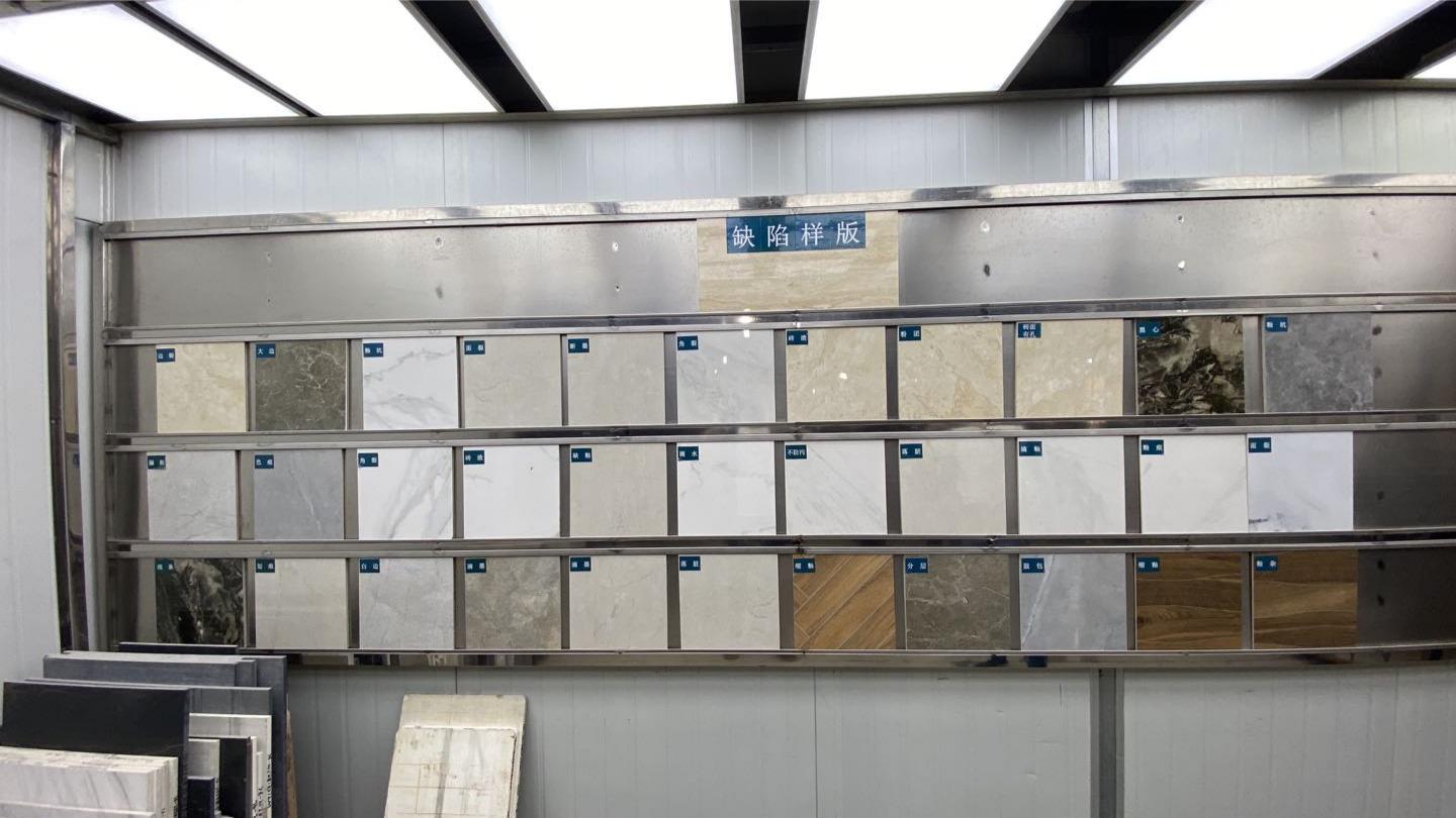 在蒙娜丽莎瓷砖生产厂区里的展示车间,瓷砖缺陷样板摆满了整整一面墙,这是瓷砖质检员在正式上岗前必须熟记的一面墙。在瓷砖生产流水线的最后一环,质检员需要肉眼识别抛光、抛釉、仿古等类型瓷砖的十余种缺陷并进行判级分拣,以保证瓷砖的产品质量。