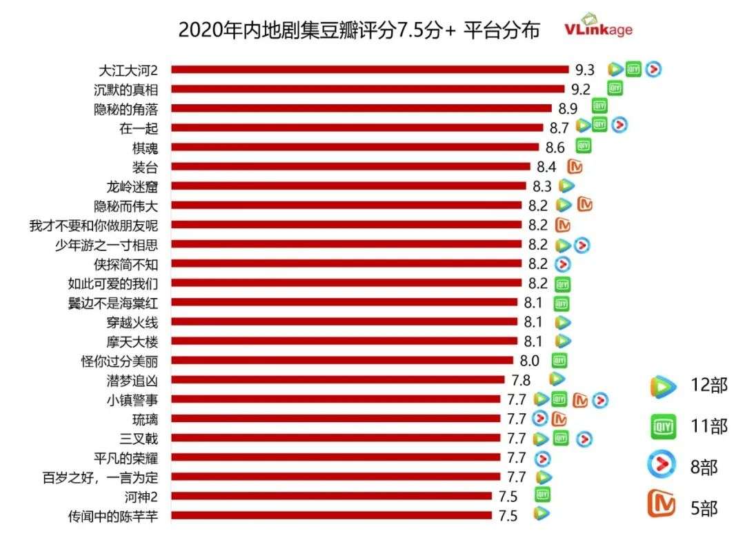 从数据表现来看,2020年在剧集口碑方面腾讯视频成绩最佳,高口碑剧集数量达到12部。