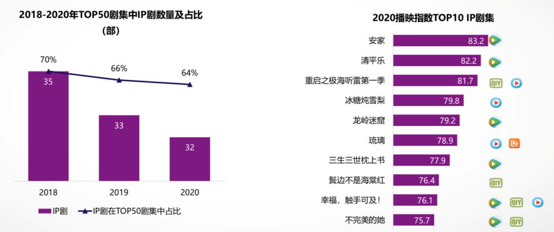 从播出方式来看,今年网络上新剧集69%是以独播方式播出,独播剧正在成为视频网站圈粉固粉、培育品牌价值的内容载体。而其中,腾讯视频的三部独播剧《三十而已》《安家》《有翡》播放指数排名前三,是今年全网关注的爆款。