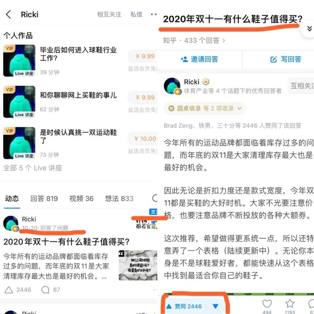 Ricki是一名拥有50万关注者的知乎大V,同时是体育产业、时尚等4个话题的优秀回答者。一个多月前的双11,他使用知乎的“好物推荐”,用3篇最为传统的图文回答做到了球鞋类商品带货100万销售额的成绩。
