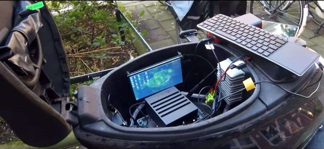于是他自己动手把自己的Vespa摩托车进行了精心改装。首先,为了让Vespa摩托车更拉风,Moscaritolo把除相机和天线外的所有设备都放在坐垫下的车厢里,加上一个简单的稳压器和一个电源按钮,就组装好了一个智能的Vespa摩托车。这个Vespa摩托车还有一个炫酷的名字——VespAI!