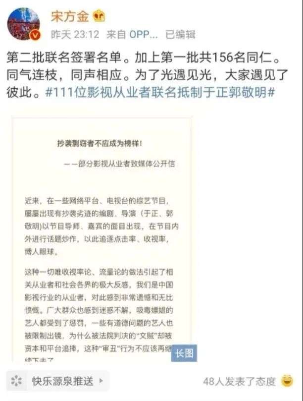 之后,谭飞、汪海林联合编剧宋方金、余飞,分头征集业内意见。12月21日晚,编剧余飞、宋方金等人在社交平台发布了111位影视从业者的联名信——《抄袭剽窃者不应成为榜样》,公开抵制有抄袭劣迹、且拒不道歉的郭敬明和于正。在联名上书的队伍中,包括琼瑶和庄羽。