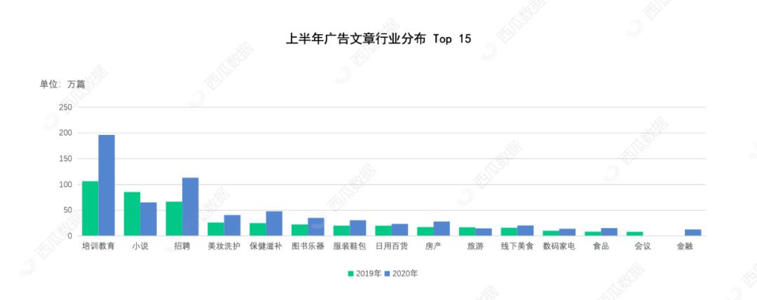 西瓜数据发布《2020年公众号广告趋势调查报告》显示,公众号中培训教育、小说、招聘行业投放广告稳居前三。其中培训教育类一直是公众号广告的大头,今年受疫情的影响,网课成为热门,广告文章增长84.55%。