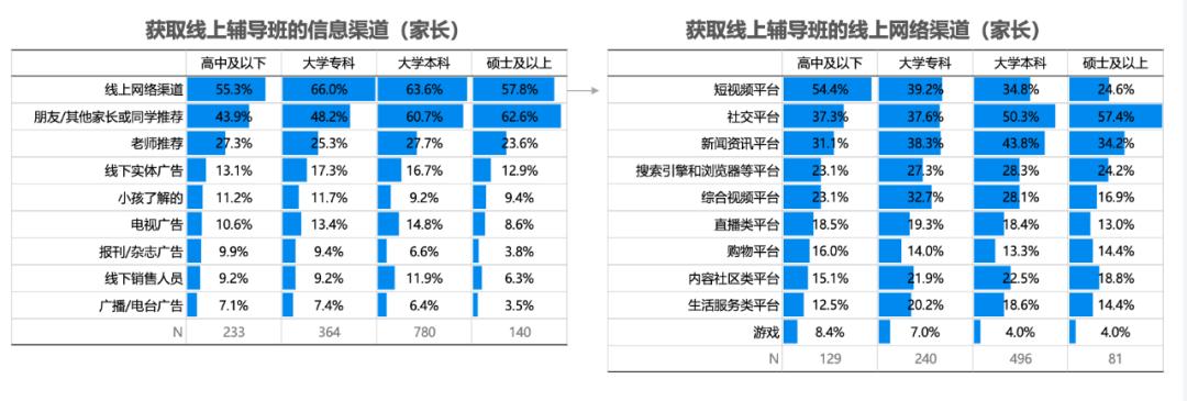腾讯发布《K12在线教育行业广告策略用户调研报告》显示,在C端获取线上辅导班信息的渠道中线上渠道占比半数,线上渠道中通过短视频渠道获取辅导班信息最高更是占比54%,且随着家长学历降低而增大。对于这类家长而言,这类贩卖焦虑的视频广告更容易达到获客的目的。而且在通过微信文章发布营销广告时,已经证明了贩卖焦虑对获客的可行性。