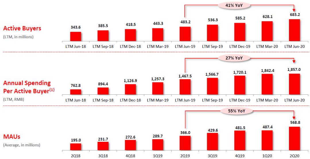 这种来自头部平台的二选一压力使拼多多的增长遭到重大阻力。2019年,拼多多的活跃买家年度消费额同比增速从95.4%下降至52.6%。