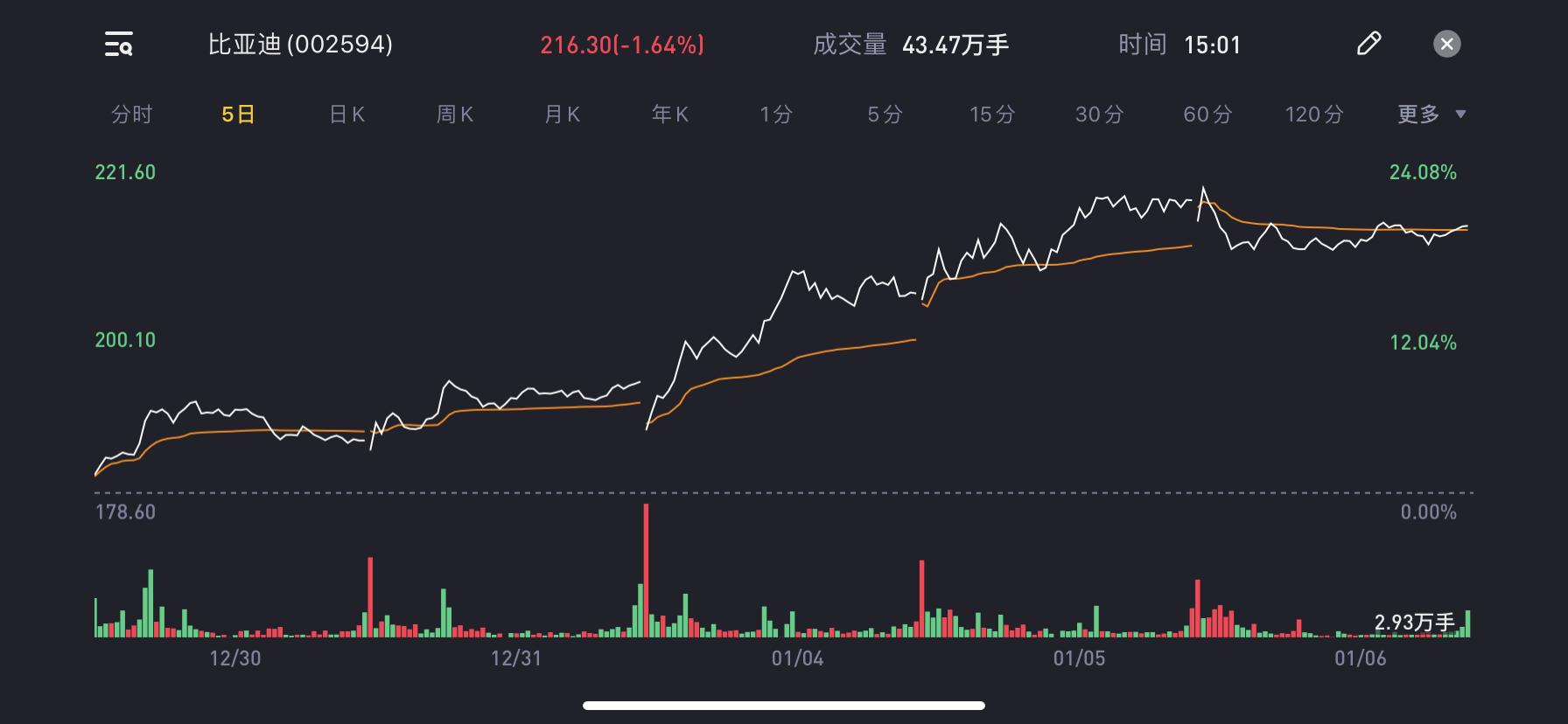 2020年12月30日到2021年1月6日,比亚迪A股股价整体呈上升趋势(图源:36氪)