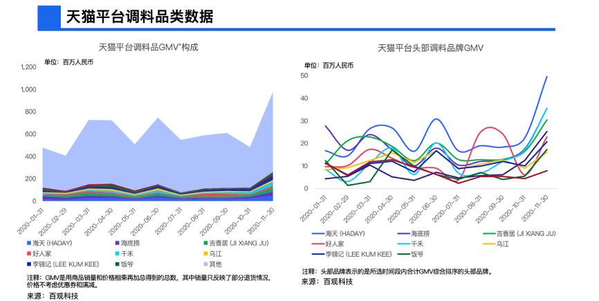 根据第三方数据分析平台百观科技数据显示,2020年前11个月里,天猫平台调味品GMV规模从2-3月开始有显著提升,6月份受618促销刺激,再度爬升到新高位。此后7-10月略有回落,11月受双十一促销影响GMV拉升明显,Top10调料品牌GMV趋势类似。