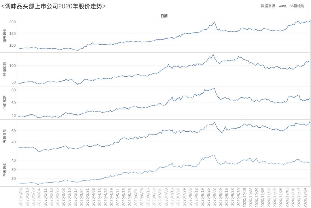 2020年,调味品市场行情火热。截至12月25日收盘,包括海天味业、颐海国际、中炬高新、天味食品、千禾味业在内的A、港股头部调味品上市公司中,其中四家市值较年初均已实现翻倍,大幅跑赢wind食品加工(一致评级)指数、申万食品饮料指数,后两者同期涨幅分别为74%、73%。