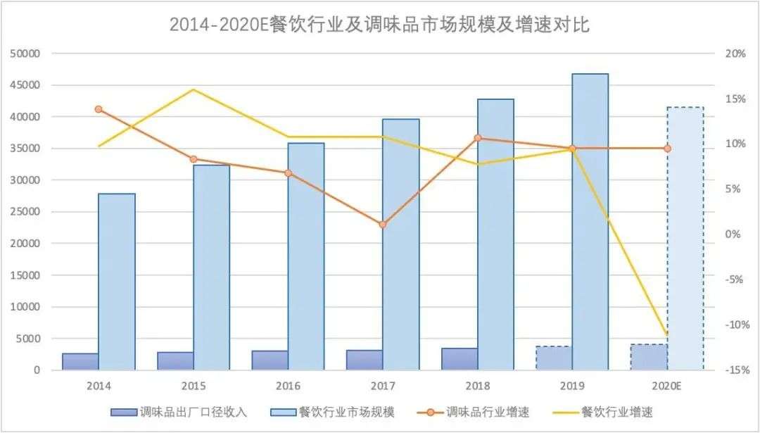 可以看到,调味品与餐饮业增速保持了高度的一致性。根据弗若斯特沙利文统计,2014年-2019年中国餐饮业复合增长率约为10.1%;根据野村东方国际证券推算,2012-2019年调味品行业出厂营收复合增速为8.7%。