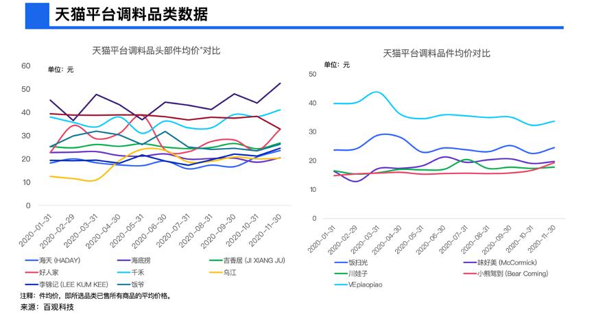 不过,从餐饮端口味向零售端平移的问题是门槛低,产品创新空间不足。目前,调味品品牌在电商渠道整体客单价并不高。根据百观科技提供的数据显示,天猫平台头部调味品品牌件均价均集中在20~40元,且整体波动性较低,用户件均价受电商平台促销刺激的效果有限。