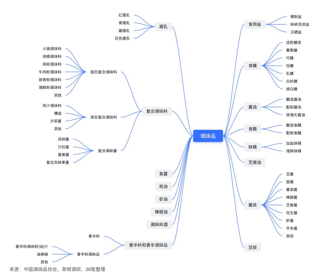 中国调味品制作工艺历史悠久,产品丰富种类,包括盐、酱油、醋、蚝油、香辛料、味精、鸡精、酱料、料酒、火锅调味料等大类。根据所用原料及工艺不同,还衍生出不同风味的细分调味品。