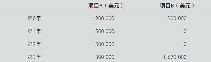 假定使用10% 的折现率,项目A 的净现值为193 160 美元,项目B 的净现值为354 700 美元。如果使用投资回收期作为判断标准,那么你会选择净现值更低的项目,它创造的价值要小得多。这个对比反映了投资回收期法的问题所在。