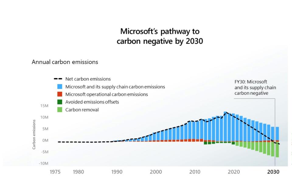 微软1975年至2030年的碳排预测(图源:微软官网)