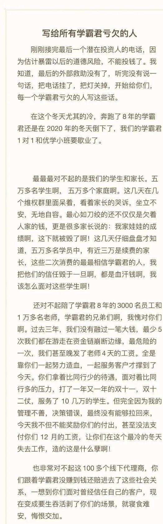 日前,学霸君破产传闻在业内传的沸沸扬扬。1月2日,学霸君创始人兼CEO张凯磊在朋友圈发布了一封公开信,表示:“学霸君最后一个潜在投资者不能投钱了,但学霸君绝不跑路,绝不推卸责任,问题不解决不宣布破产。”